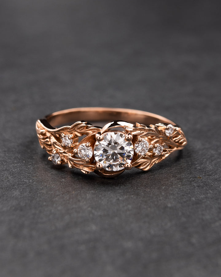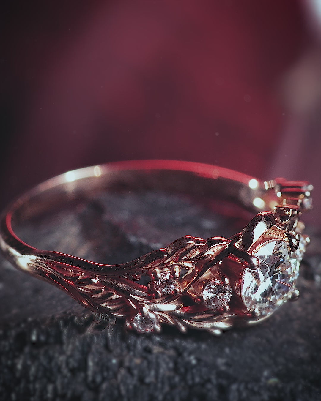 Delicately sculpted this leaves band would be perfect for alternative engagement ring seekers. You can see Japanese maple leaves wrapping the central gemstone - lab grown diamond. Sparkling diamonds are scattered between gold leaves reminding dew in the forest.