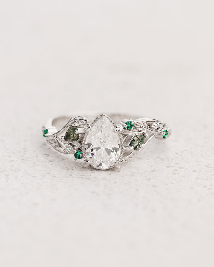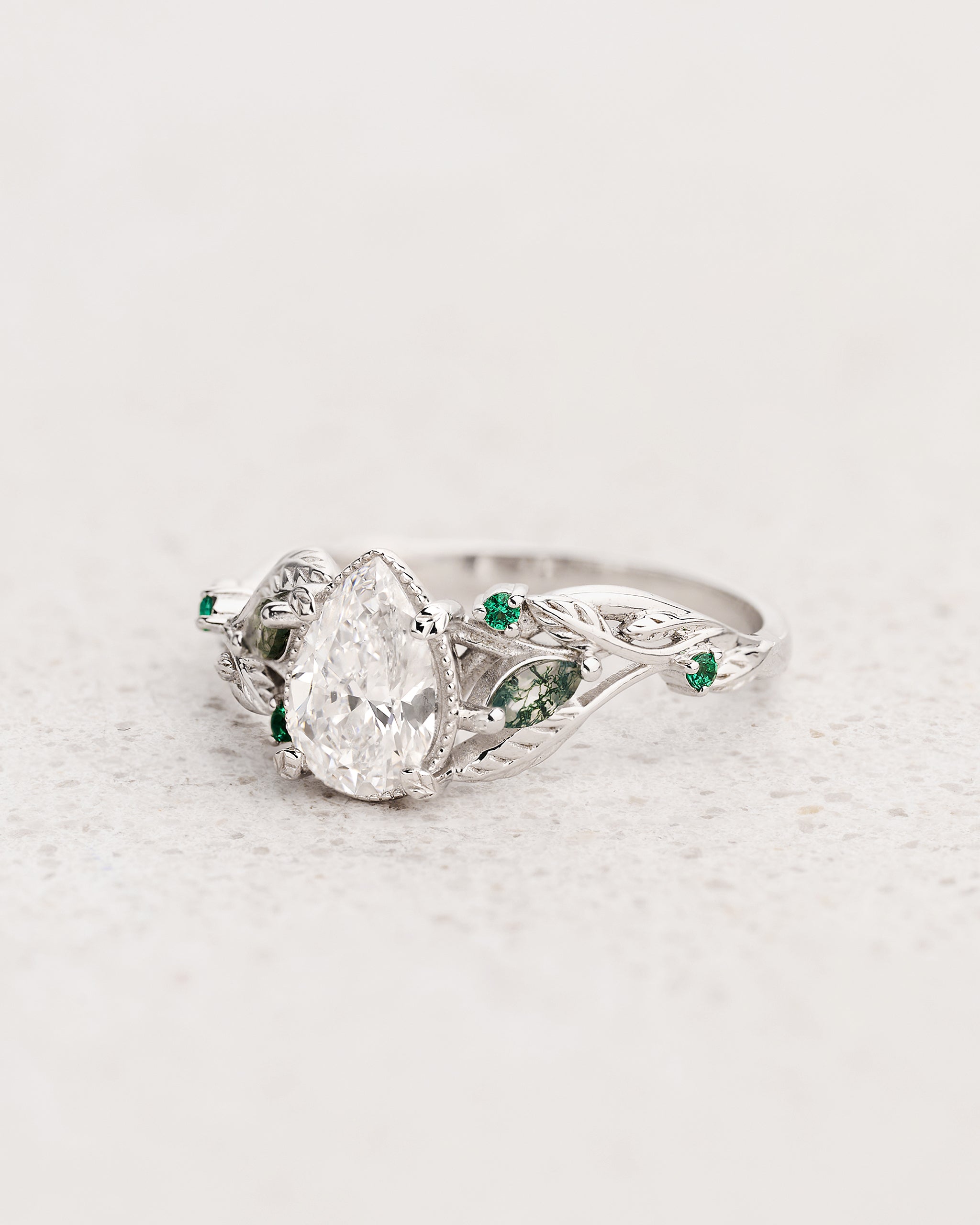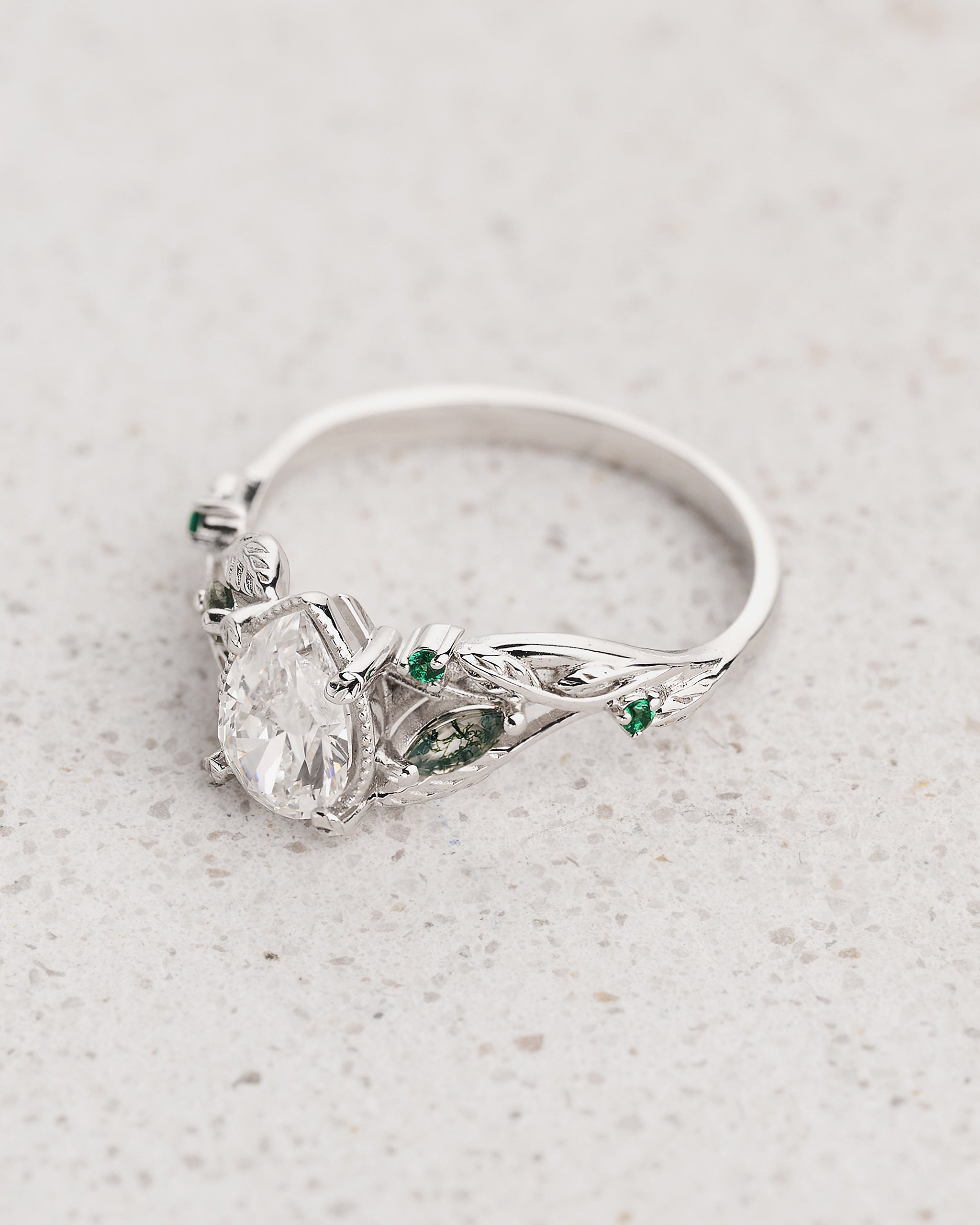 Diamond Engagement Ring with Accent Moss Agates & (Lab-grown) Emeralds / Patricia