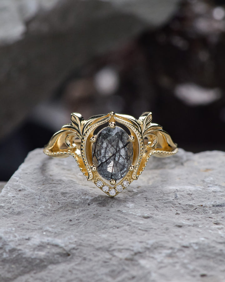 READY TO SHIP: Lida engagement ring with oval cut rutile quartz in 14K yellow gold, RING SIZES: 5.5 - 8.5 US