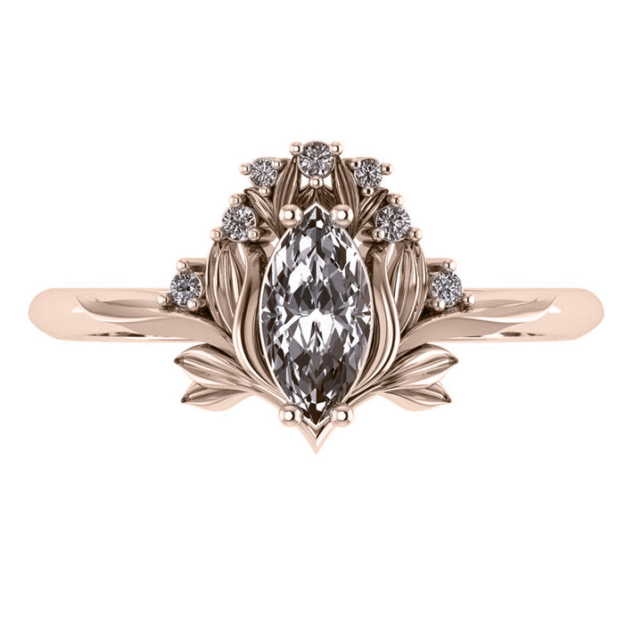 Make a statement of love and elegance with the enchanting Iris engagement ring. This nature-inspired masterpiece is a unique engagement ring that captures the essence of beauty and romance. Reminiscent of a blooming Iris flower bud, the ring features exceptional detailing and a crown of foliage sculpted around a marquise cut gemstone.
