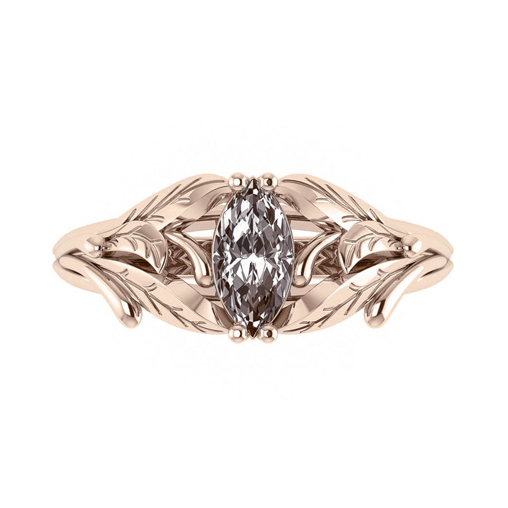 The nature inspired engagement ring features a botanical design with detailed leaves wrapping around the central gemstone. It has a romantic mood with a touch of vintage inspired style.