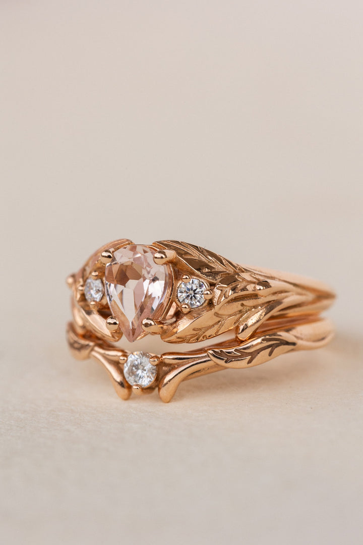 Natural Rose Pear Cut Morganite Gold Engagement Ring with Side Diamonds and Matching Leaf Band