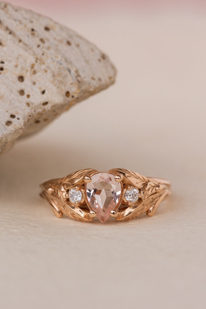 Morganite and side diamonds engagement ring, nature inspired gold proposal ring