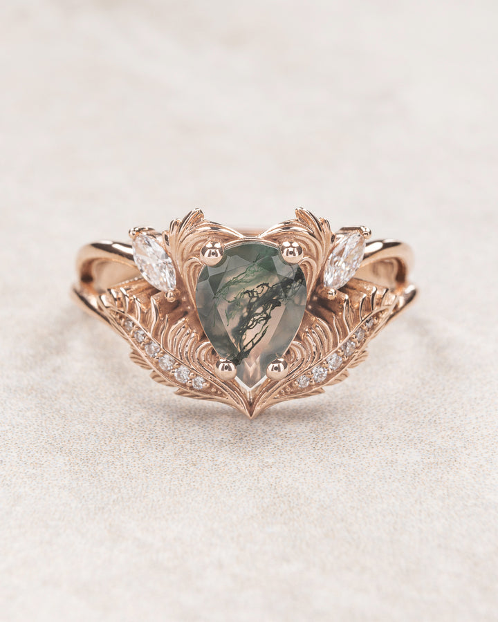 This unique engagement ring features author's design inspired by nature. Solid gold ring is adorned with pear cut natural one of a kind moss agate, accent stones: marquise cut and round cut diamonds. You can choose natural diamonds or lab grown diamonds in option. Leaves are highly detailed and features best quality of fine jewelry work.