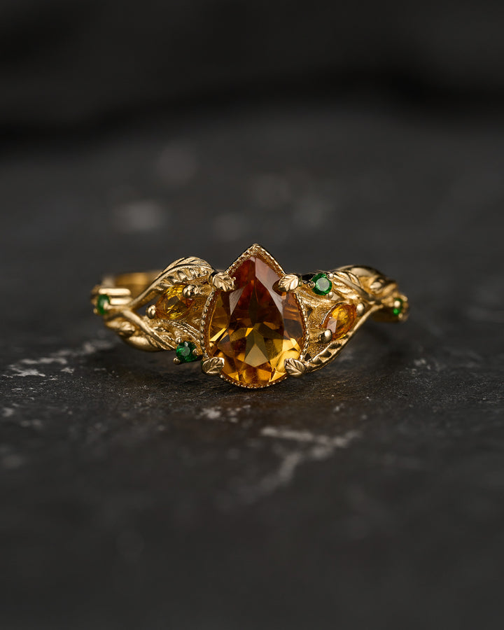 READY TO SHIP: Patricia ring in 14K yellow gold, orange citrine, pear cut 8x6 mm, accent sapphires & garnets, AVAILABLE RING SIZES: 5.5 - 8.5 US