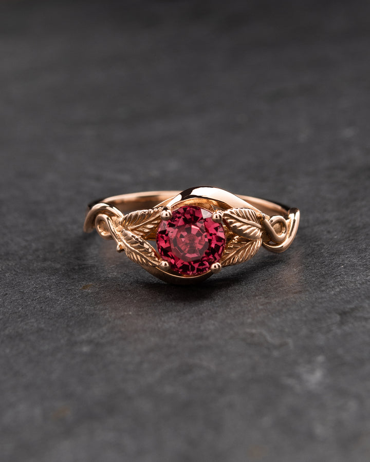 It's all about harmony and romance. Azalea ring will represent your tender feelings and serious intentions in the best way. Handcrafted from solid gold this engagement ring features detailed leaves and organic lines wrapped around the round cut gemstone.