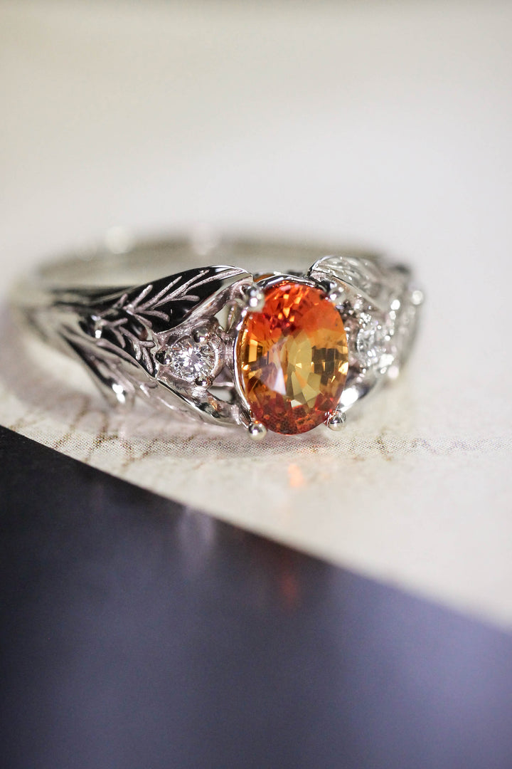 Wisteria engagement ring is made from solid white gold and adorned with oval cut orange sapphire and two diamonds. Nature ring features botanical design with detailed leaves and romantic mood with touch of vintage inspired style.