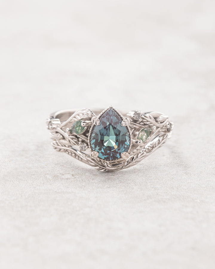 Alexandrite and moss agates bridal ring set, stacking twig engagement ring / Patricia