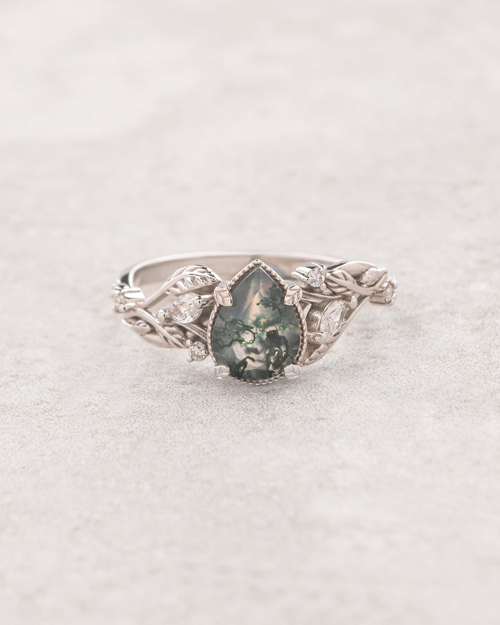Unique moss agate engagement ring with diamonds, nature themed leaves and diamonds ring