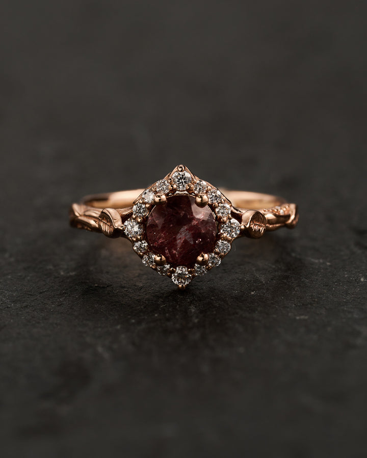 We called this ring Florentina - it comes from Roman name Florentius, which was from the Latin word florens, meaning "blossoming, flourishing". Central gemstone surrounded by a rich diamond halo is placed on a delicate branch and surrounded with lovely petals - this composition reminds of a flower bud and leaf shapes were inspired by rose vines.