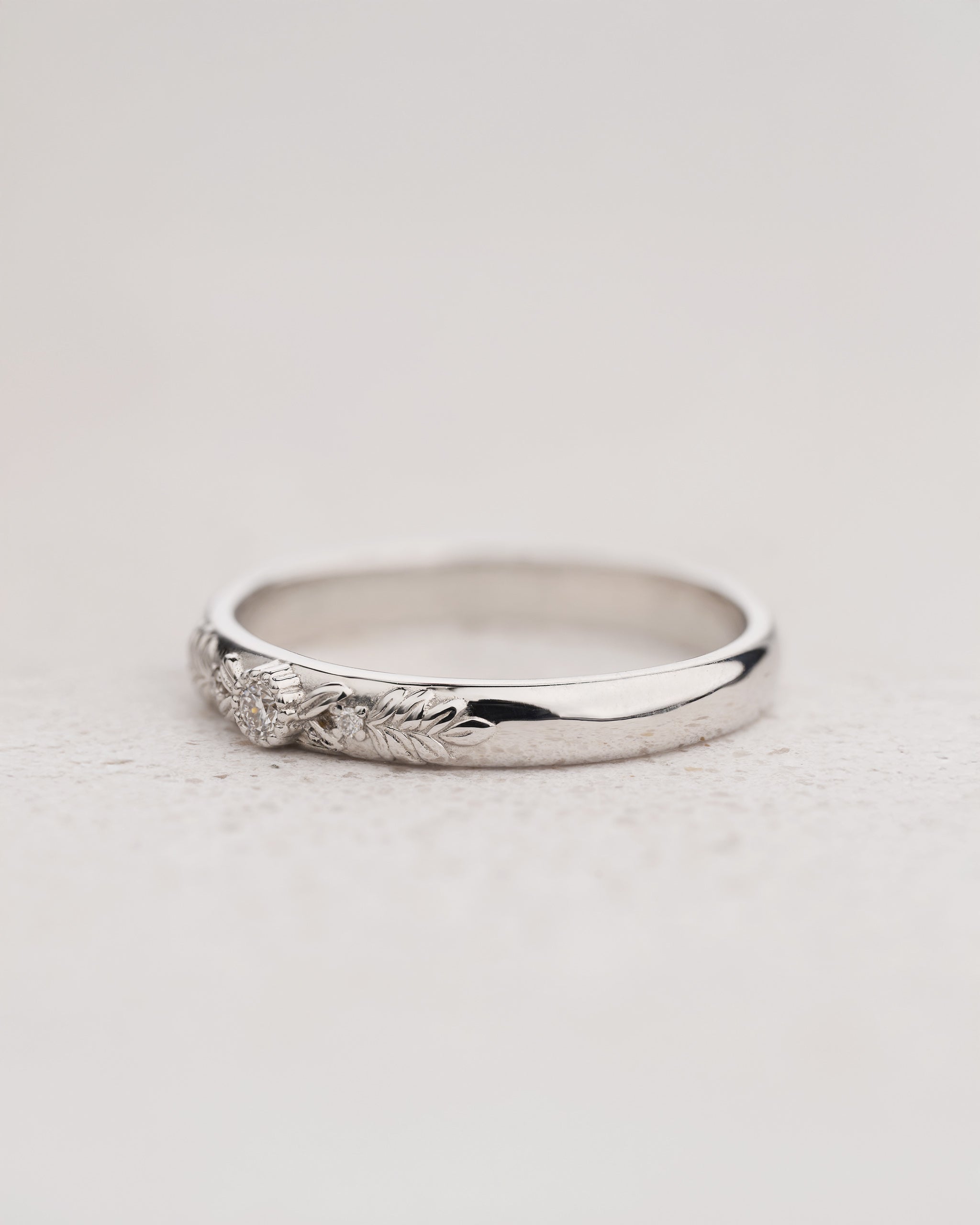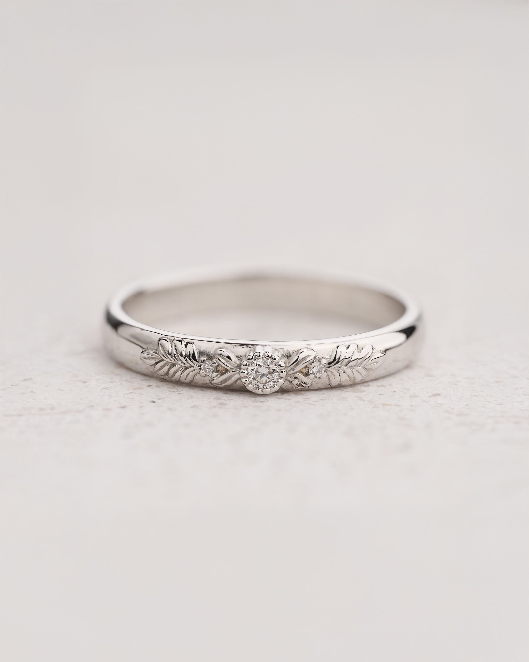 Lovely wreath wedding band features detailed design with tiny leaves and lab-grown diamonds. Wedding band has 3mm width and is comfortable to stack with other straight bands. Classical yet original design is meant to be cherished by generations.