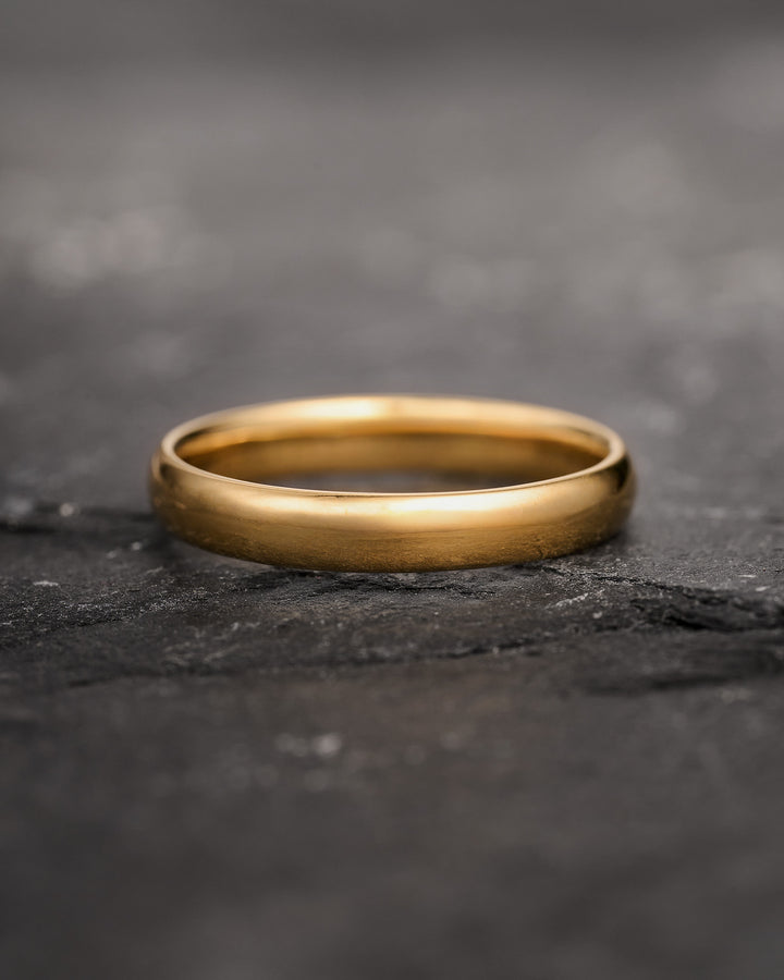 Solid gold unisex wedding band features classical design with polished finish. Comfort fit and 4 mm wide band makes it perfect for those who haven't used to wear any jewelry.