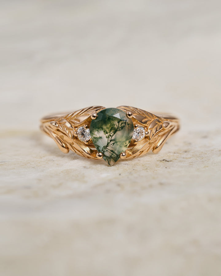 This Wisteria engagement ring features pear-cut natural green moss agate. Unique proposal ring is adorned with two accent lab-grown diamonds.