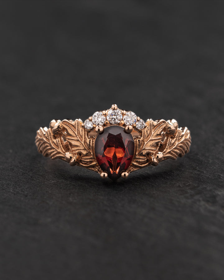 Diamond crown and garnet engagement ring, gorgeous nature inspired proposal ring