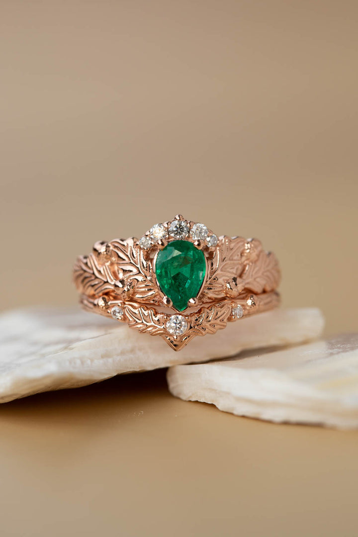 This listing is for two rings: Oak tree leaves engagement ring with pear natural emerald and diamond crown and oak leaves wedding band.