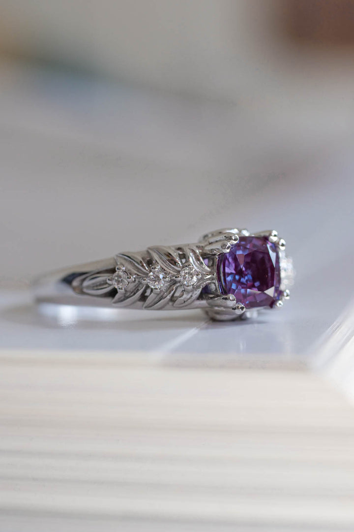 This unique engagement ring is made from solid gold and adorned with lab alexandrite as a central gemstone and manmade or diamonds as accents. Nature ring features botanical design with detailed leaves and romantic mood with touch of vintage inspired style.