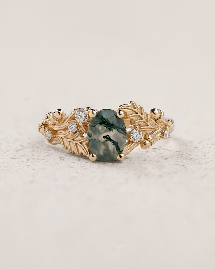 Moss agate engagement ring, gold oak leaves and diamonds proposal ring / Silviya