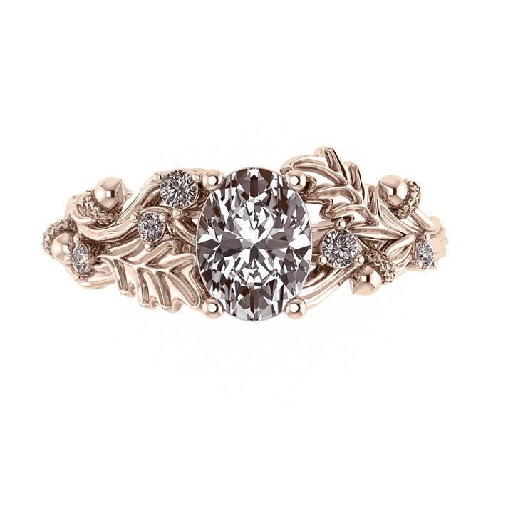 Name Silviya means ‘From the Forest’ and this is what our nature inspired ring design shows. Highly detailed oak tree leaves are arranged around the central gemstone and tiny acorns with sparkling diamonds are scattered between the twigs. Ring is textured and looks like a real tree branch. This composition is asymmetrical and shows a very natural look.