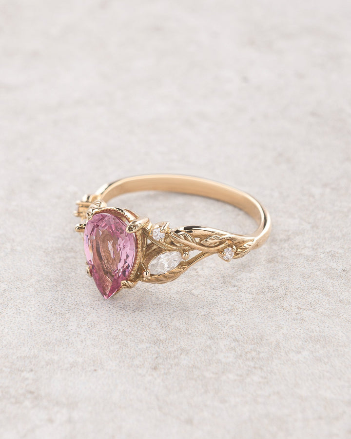 Natural pink spinel engagement ring, gold nature inspired engagement ring with leaves and diamonds