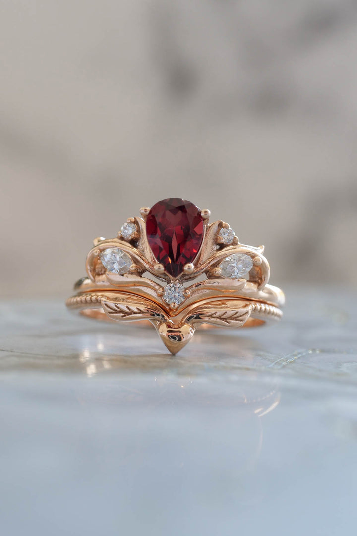 Pear shaped garnet engagement ring, alternative bridal ring set