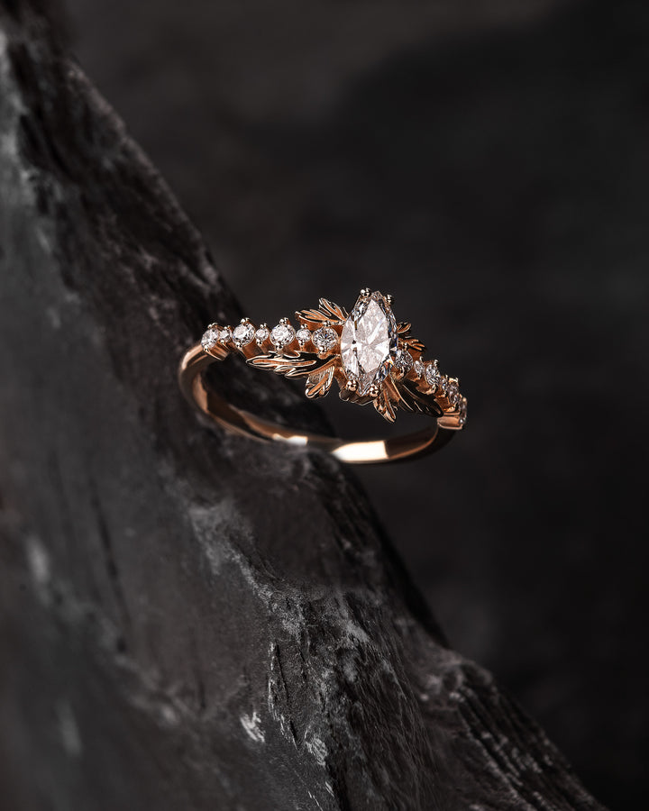 Marquise lab grown diamond engagement ring, gold leaf ring / Verbena