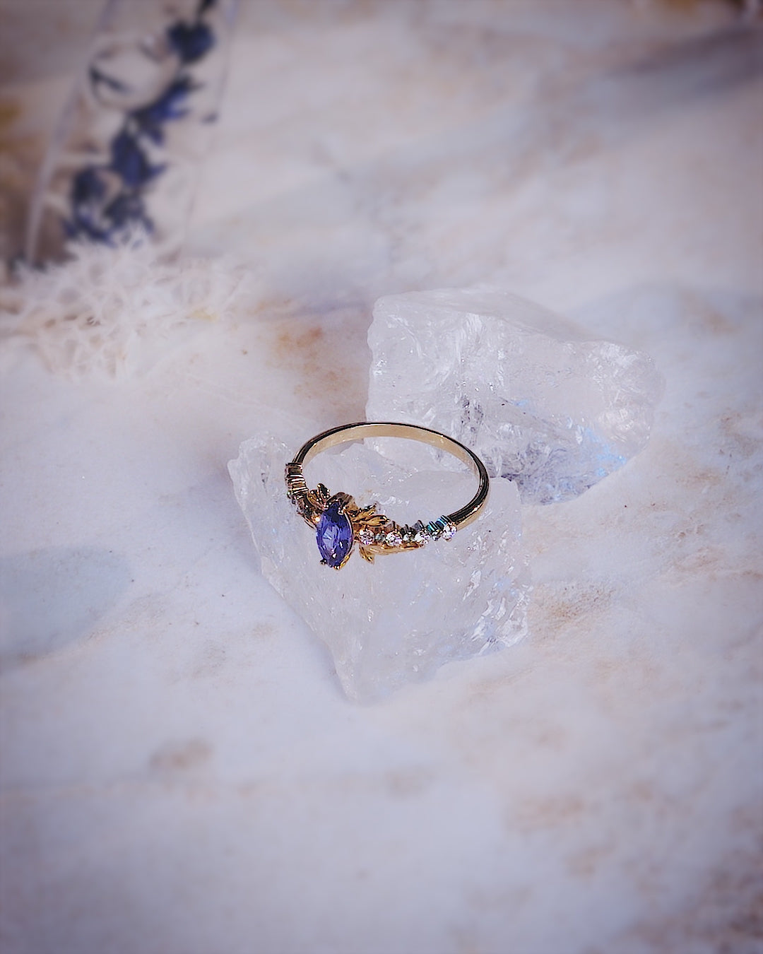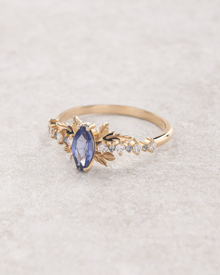 Natural blue sapphire with accents diamonds and blue sapphires engagement ring, nature inspired gold leaf ring