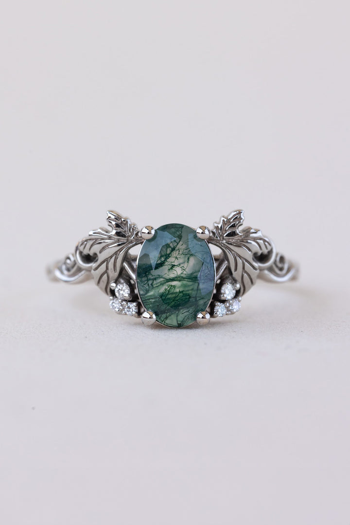 READY TO SHIP: Vineyard engagement ring in 14K white gold, oval moss agate, accents lab grown diamonds, RING SIZE: 5.5 - 8.5 US