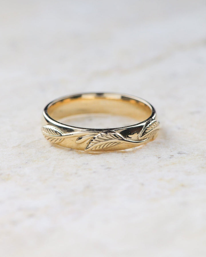 Yellow gold nature inspired wedding band, comfort fit ring for him