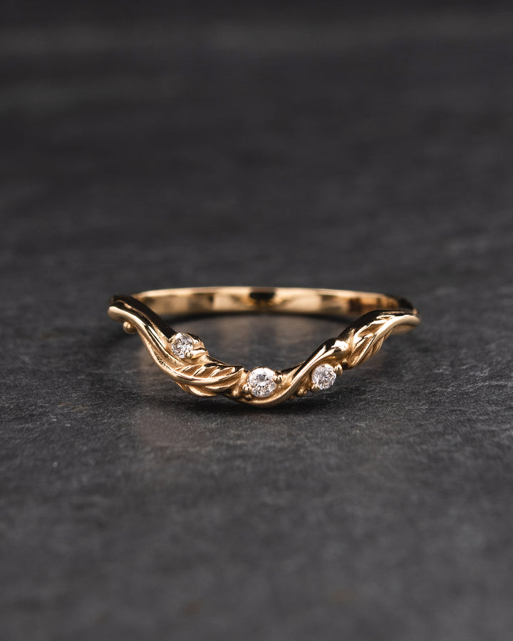 Curved leaf wedding band with diamonds, yellow gold | Matching ring for Undina