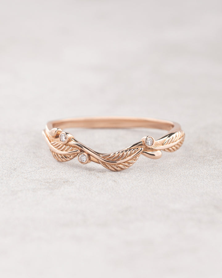 Designed especially as a matching wedding band for our Azalea engagement ring, it can be used alone as well. Gold twig ring features delicate design with three leaves and is adorned with three diamonds - you can choose lab grown or natural ones as an option.