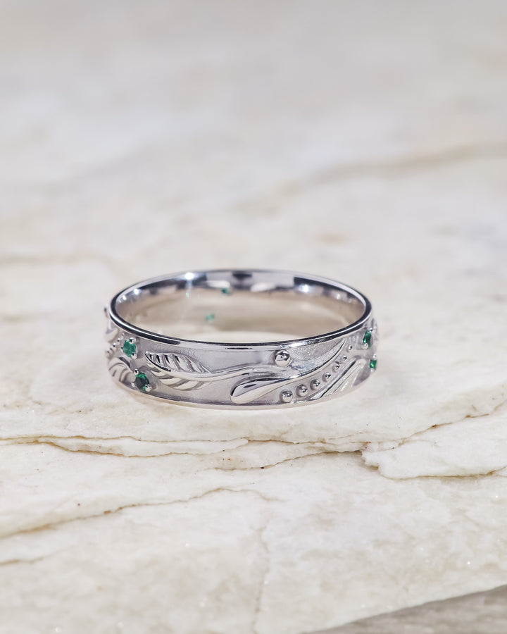 If you've chosen Callisto engagement ring for her, this ring could be an option for man's wedding band. It features matching leaf design with carved elements all around the band. This version has lab emerald gemstones, but is available with other gemstones or without any as well.
