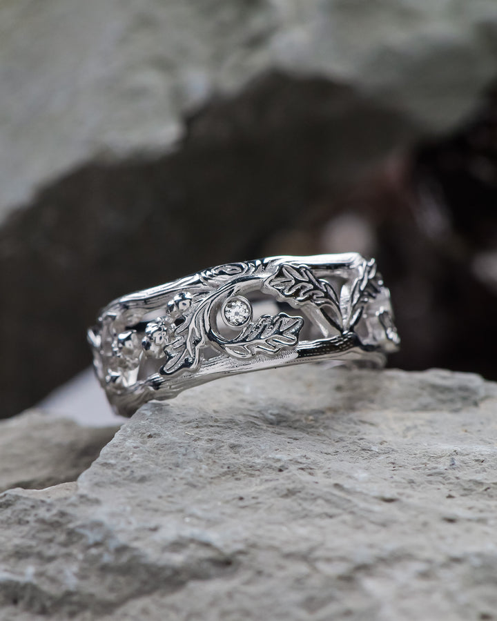 Amazingly detailed, our wedding band for man features oak leaves, four diamonds, and tiny acorns between textured bark. This is our original design, and you won't see it mass-produced.