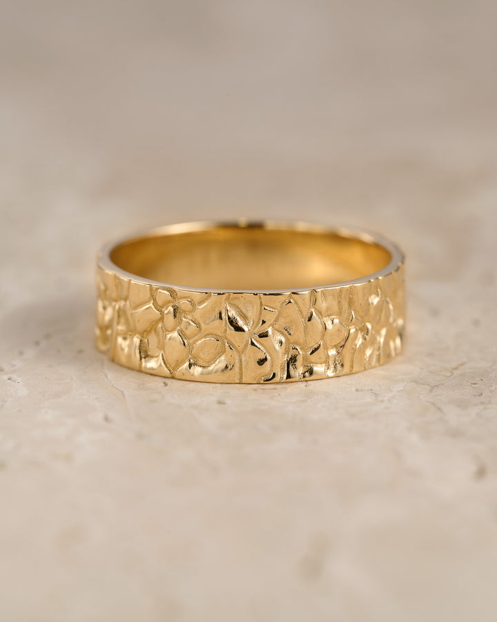 This unusual wedding band for man has a wide profile with unique rock texture.