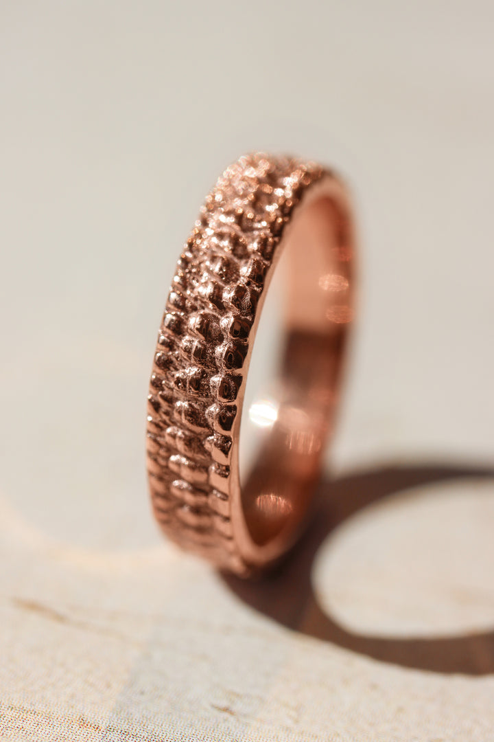 This unusual unisex wedding band has a middle-width comfort profile with unique texture of crocodile's skin. Textured ring looks original and modern, you won't find anything similar mass produced. Stylish wedding ring is comfortable for everyday wear.