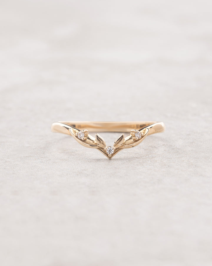 This diamond wedding band was designed especially to match with our Verbena engagement ring, but can be used separately as well. It features nature inspired style with tiny leaves and curved shank. Goes perfectly as a stacking ring, but you can wear it as a single ring as well.