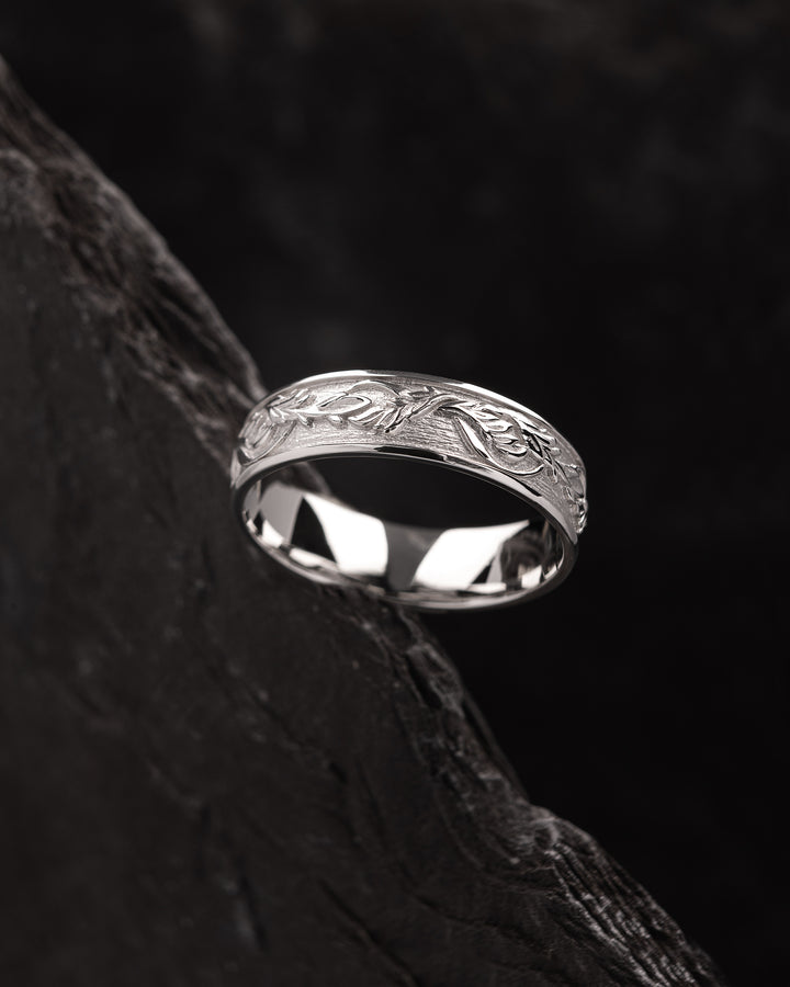 Original yet classic this nature wedding band will be a great choice for a person who looks for a comfortable ring to wear everyday. Features japanese maple leaves pattern created by an artist.