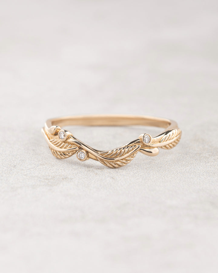 Designed especially as a matching wedding band for our Azalea engagement ring, it can be used alone as well. Gold twig ring features delicate design with three leaves and is adorned with three diamonds - you can choose lab grown or natural ones as an option.