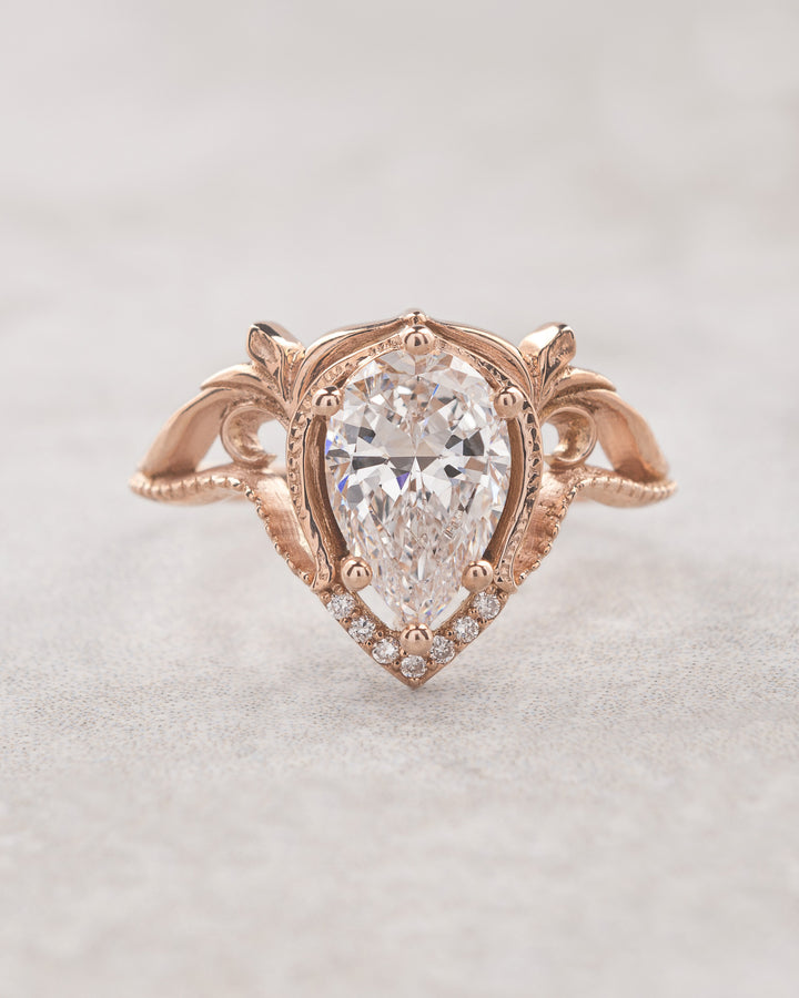 This is an upgraded version of our Lida engagement ring. Art nouveau inspired  engagement ring features sophisticated style and timeless look. Large pear cut gemstone is surrounded by stylised flowers and adorned with sparkling diamonds.