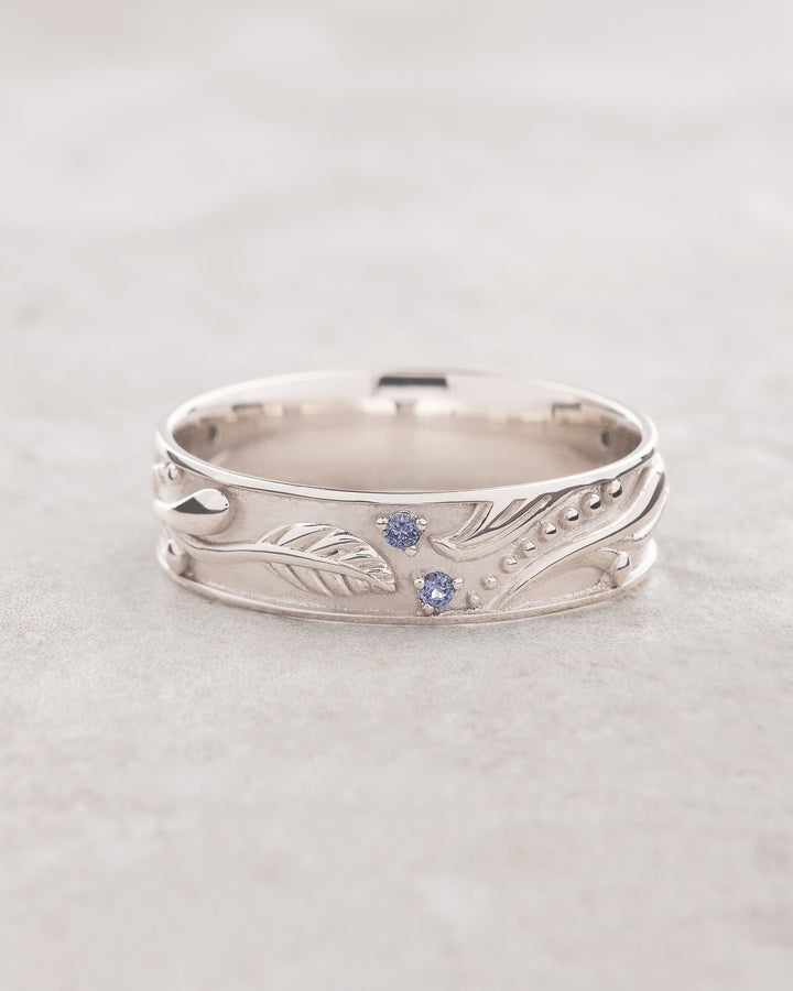 If you've chosen Callisto engagement ring for her, this ring could be an option for man's wedding band. It features a matching leaf design with carved elements all around the band.