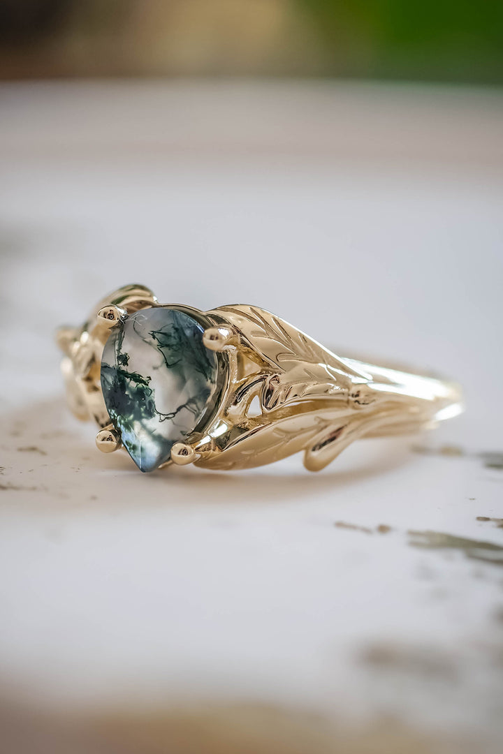 Moss agate gold ring, leaves engagement ring / Wisteria