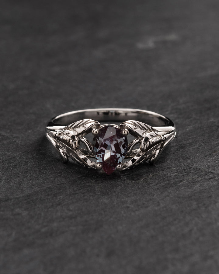 Wisteria ring features teardrop shape gemstone surrounded by detailed gold leaves. This engagement ring is truly magical - gemstone changes colours depending on a lighting.