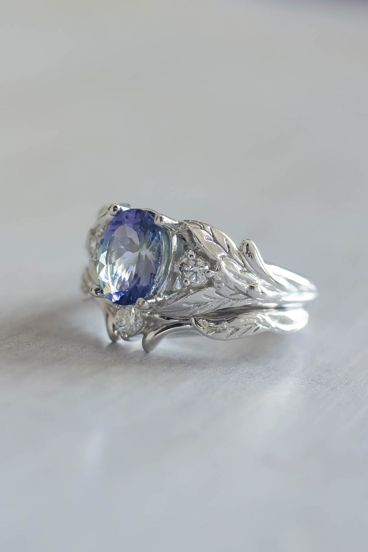 Tanzanite bridal ring set, gold leaf rings with diamonds