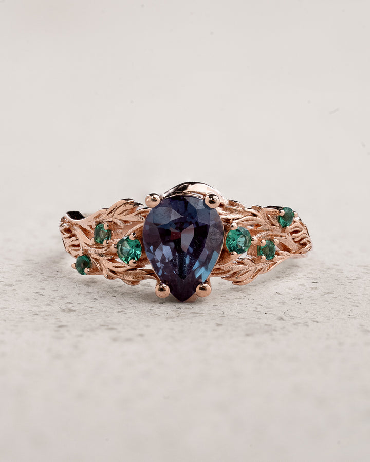 Сolor-Сhanging Alexandrite Engagement Ring with Accent Emeralds / Japanese Maple