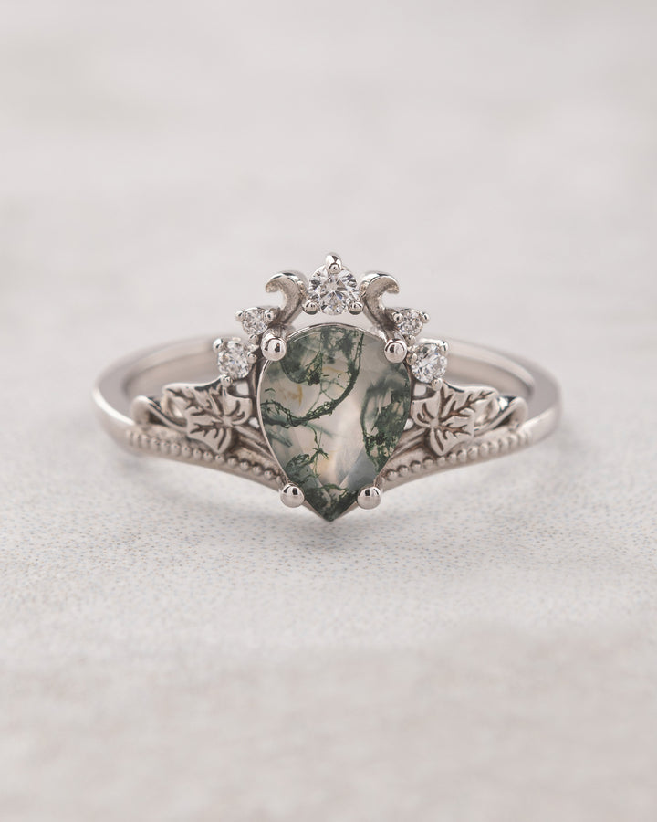 READY TO SHIP: Ariadne engagement ring with pear moss agate and lab grown diamonds, 14K white gold, RING SIZES: 5.5 - 8.5 US