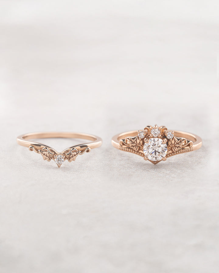 Magnificent wedding ring set features nature inspired style with tiny ivy leaves and the most delicate details you can imagine. Round cut lab grown diamond has great quality and sparkle. Small accent lab grown diamonds compliments this romantic jewelry piece.