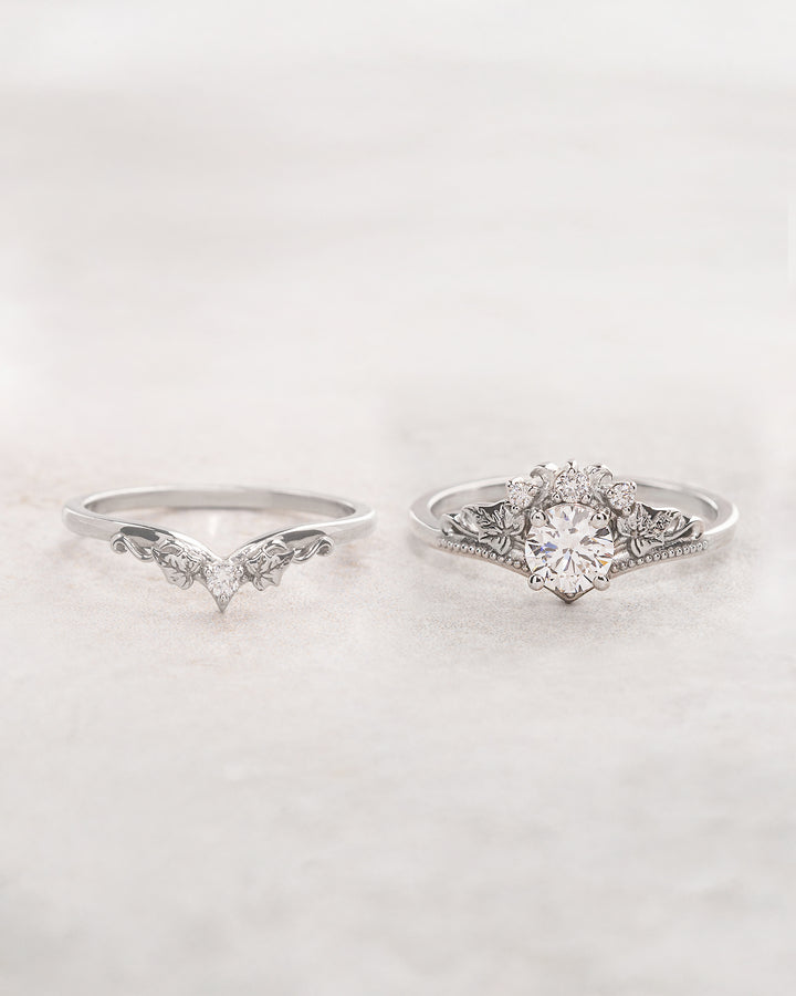 Magnificent wedding ring set features nature inspired style with tiny ivy leaves and the most delicate details you can imagine. Round cut lab grown diamond has great quality and sparkle. Small accent diamonds compliments this romantic jewelry piece.