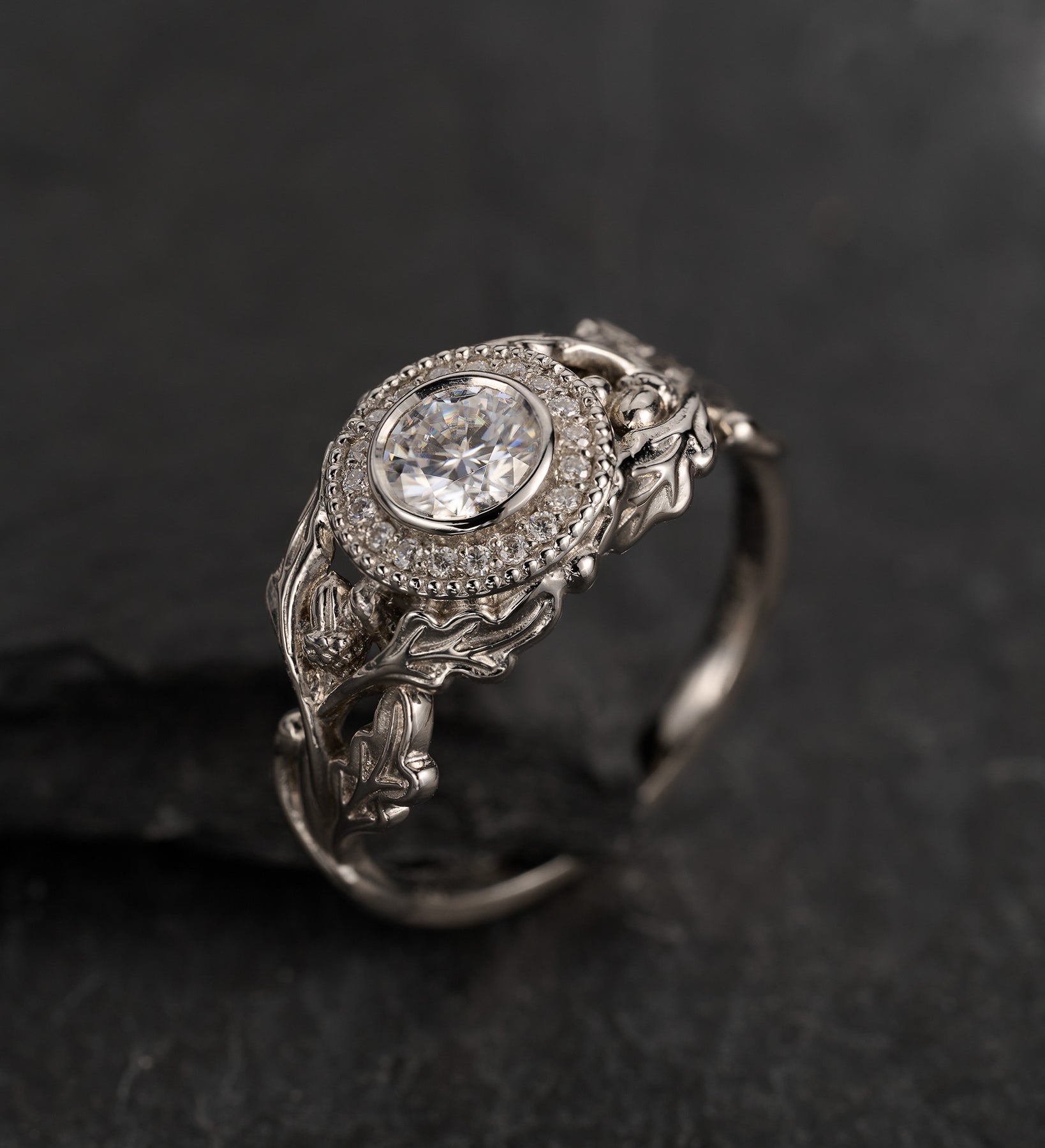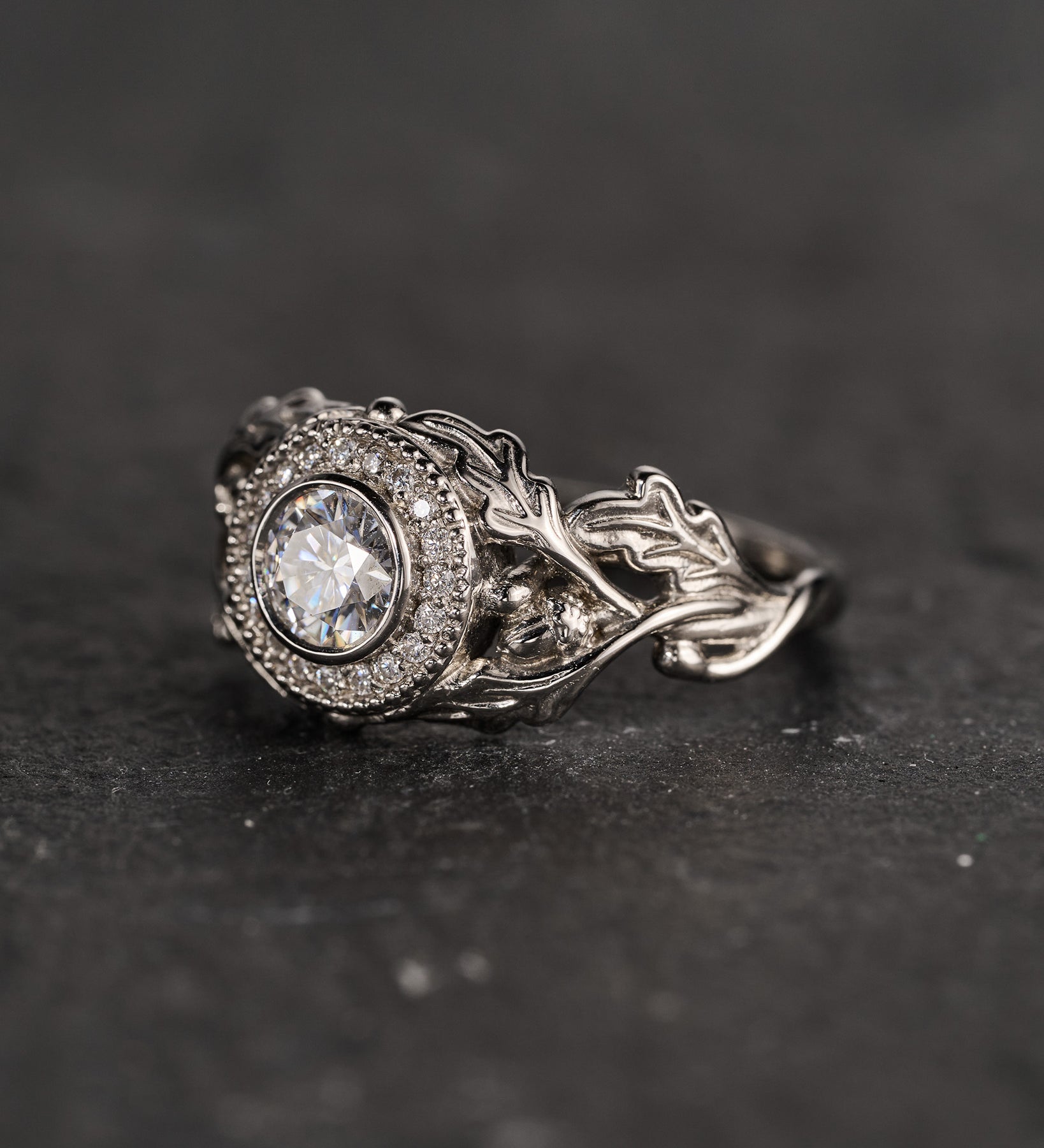 Dair is an eye-catching piece, with a round or marquise cut gem surrounded by a diamond halo and supported by delicate yet sturdy oak branches. Look closely for the petite acorns, symbols of potential and longevity. This is a ring to be cherished by generations. Dair comes in rose, yellow, or white gold (14K or 18K).