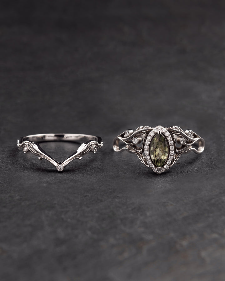 Callisto name came from Greek and means "most beautiful". This art nouveau inspired engagement ring is truly one of the most exquisite from our collection. It features central marquise cut gemstone surrounded by sparkling diamond halo and hold by skilfully make leaves composition.