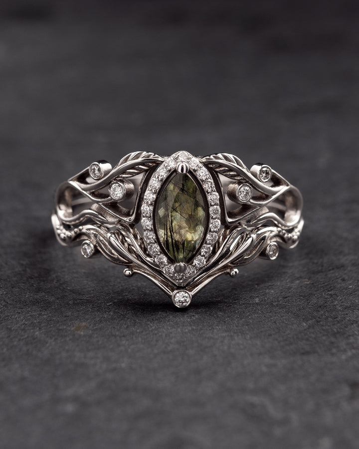 Rutile peridot bridal ring set in art nouveau inspired style / Callisto