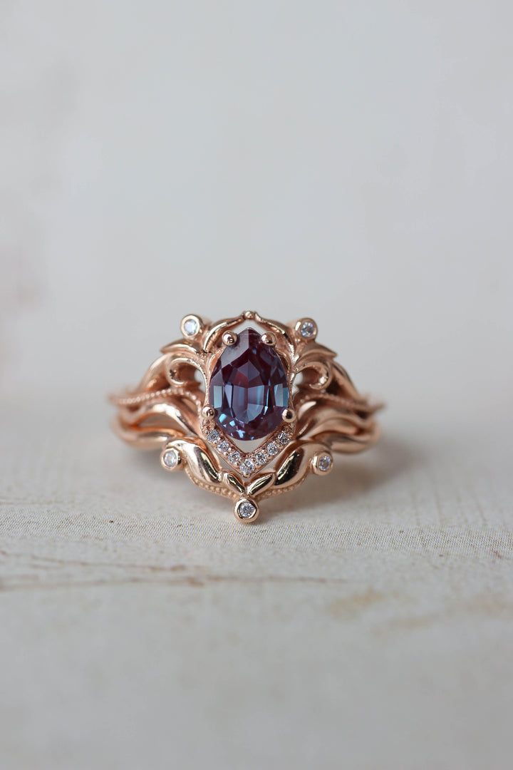 Exceptionally delicate, this bridal set is inspired by art nouveau style. Pear cut gemstone is surrounded by stylised flowers and adorned with sparkling diamonds. Lab alexandrite is truly magical - it changes colours depending on a lighting. It is teal / purple at the daylight and reddish purple under sun or electrical light.